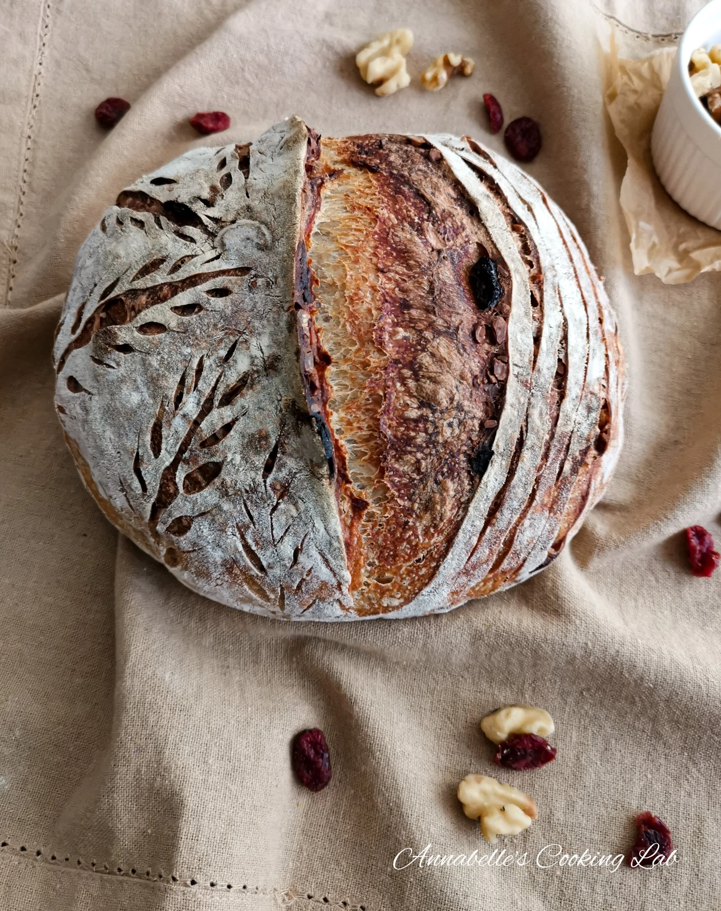This sourdough base also serves as a versatile foundation for any add-ins: dried cranberries and walnuts (shown below), sesame and poppy seeds, or sun-dried tomatoes. For additional ingredients, incorporate them into the dough during the 4th set of coil and folds.